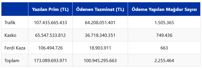 Trafik, kasko ve ferdi kaza sigortalarında bu yılın ilk yarısında yazılan prim, ödenen tazminat tutarı ve ödeme yapılan mağdur sayısı şöyle: