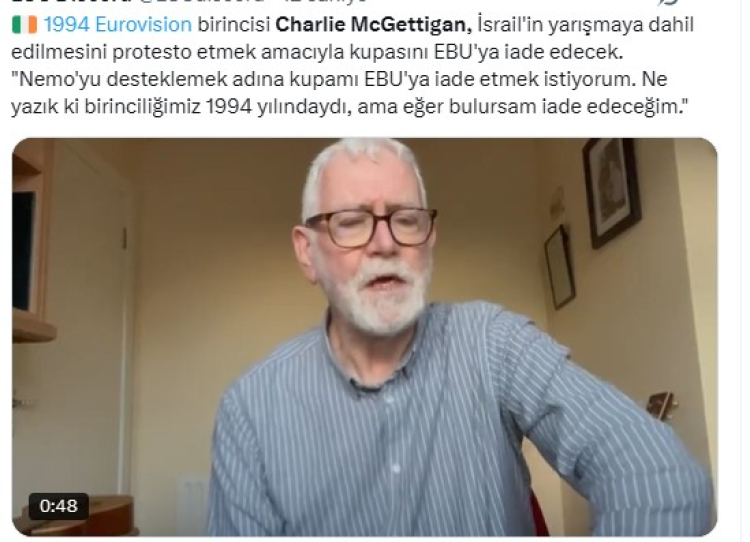 İSTANBUL (İGFA) – İsrail’in 2026 Eurovision Şarkı Yarışması’na katılmasına izin verilmesine tepkiler devam ediyor. İrlandalı şarkıcı Charlie McGettigan, sosyal medya hesabından yayımladığı videoda, 1994 Eurovision Şarkı Yarışması ödülünü iade edeceğini duyurdu.